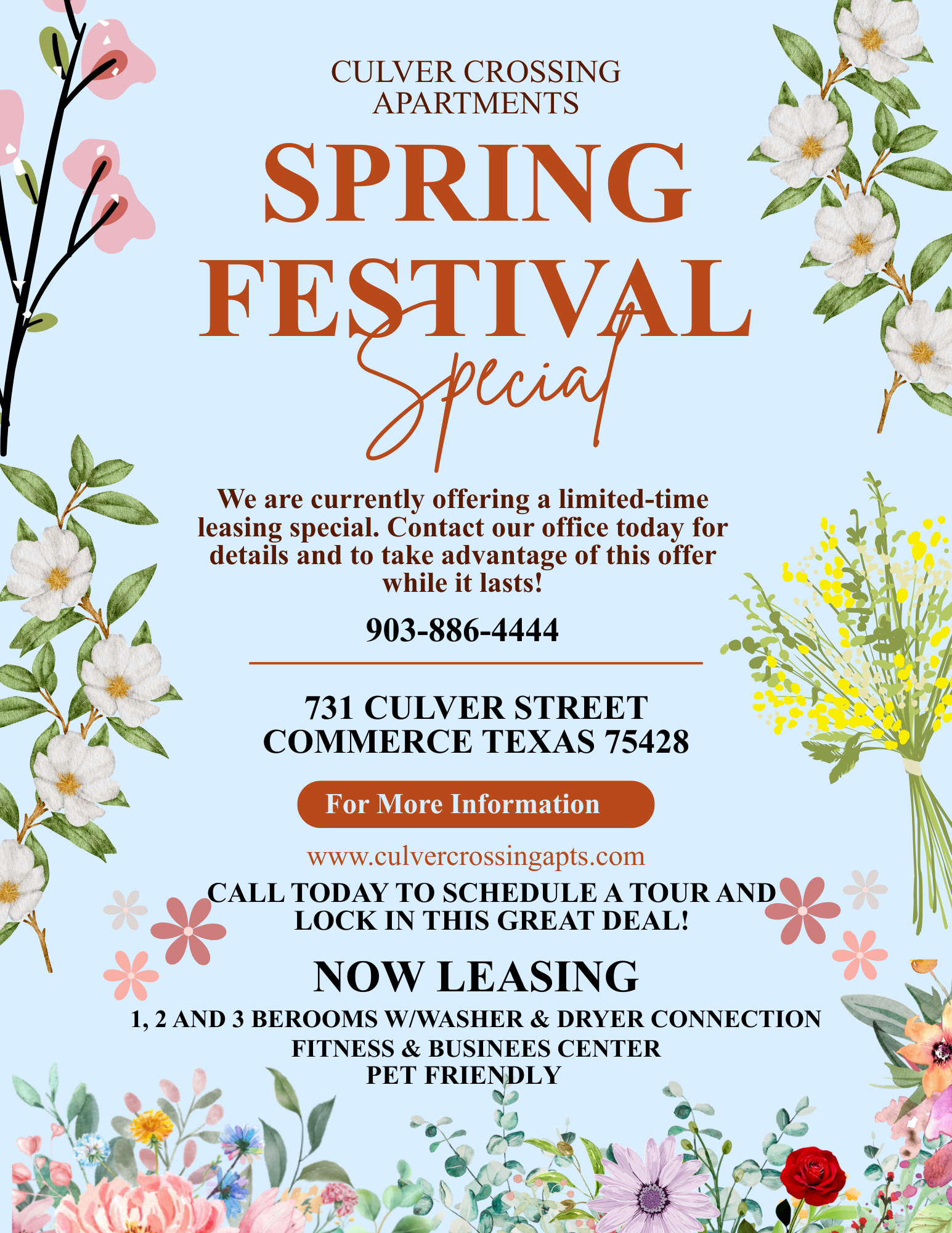 Culver Crossing presents affordable apartment homes with style and elegance to provide and enhance our residents’ way of life. This quaint apartment community in East Texas offers the best of both the small town atmosphere combined with urban luxury. Families will enjoy easy access to outstanding schools, including Texas A&M Commerce, Commerce ISD, and many of the local lakes and recreation areas.
