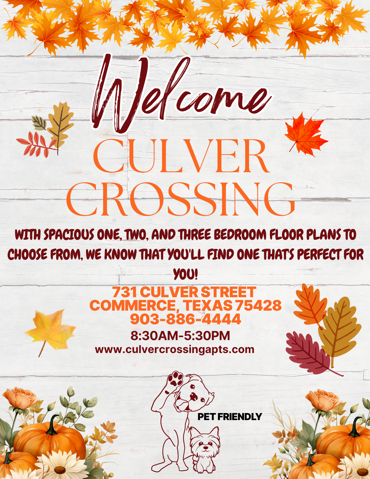 Culver Crossing presents affordable apartment homes with style and elegance to provide and enhance our residents’ way of life. This quaint apartment community in East Texas offers the best of both the small town atmosphere combined with urban luxury. Families will enjoy easy access to outstanding schools, including Texas A&M Commerce, Commerce ISD, and many of the local lakes and recreation areas.